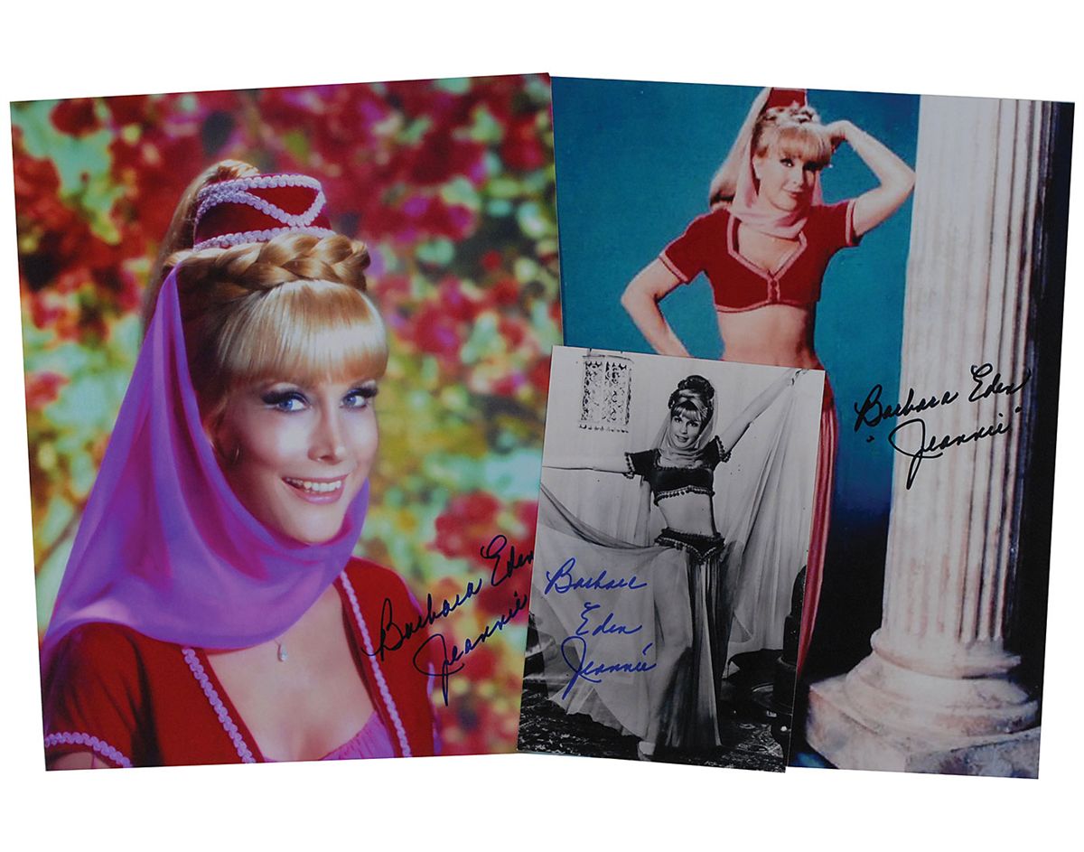Three signed glossy and satin-finish photos, two 8 x 10 and one 4 x 6, including two color, each signed in felt tip, “Barbara Eden ‘Jeannie.’” In fine condition.