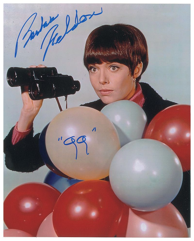 Color satin-finish 8 x 10 photo of Feldon as Agent 99 in Get Smart, signed in blue felt tip “Barbara Feldon, ‘99.’” In fine condition, with scattered marks inherent to the original photo.