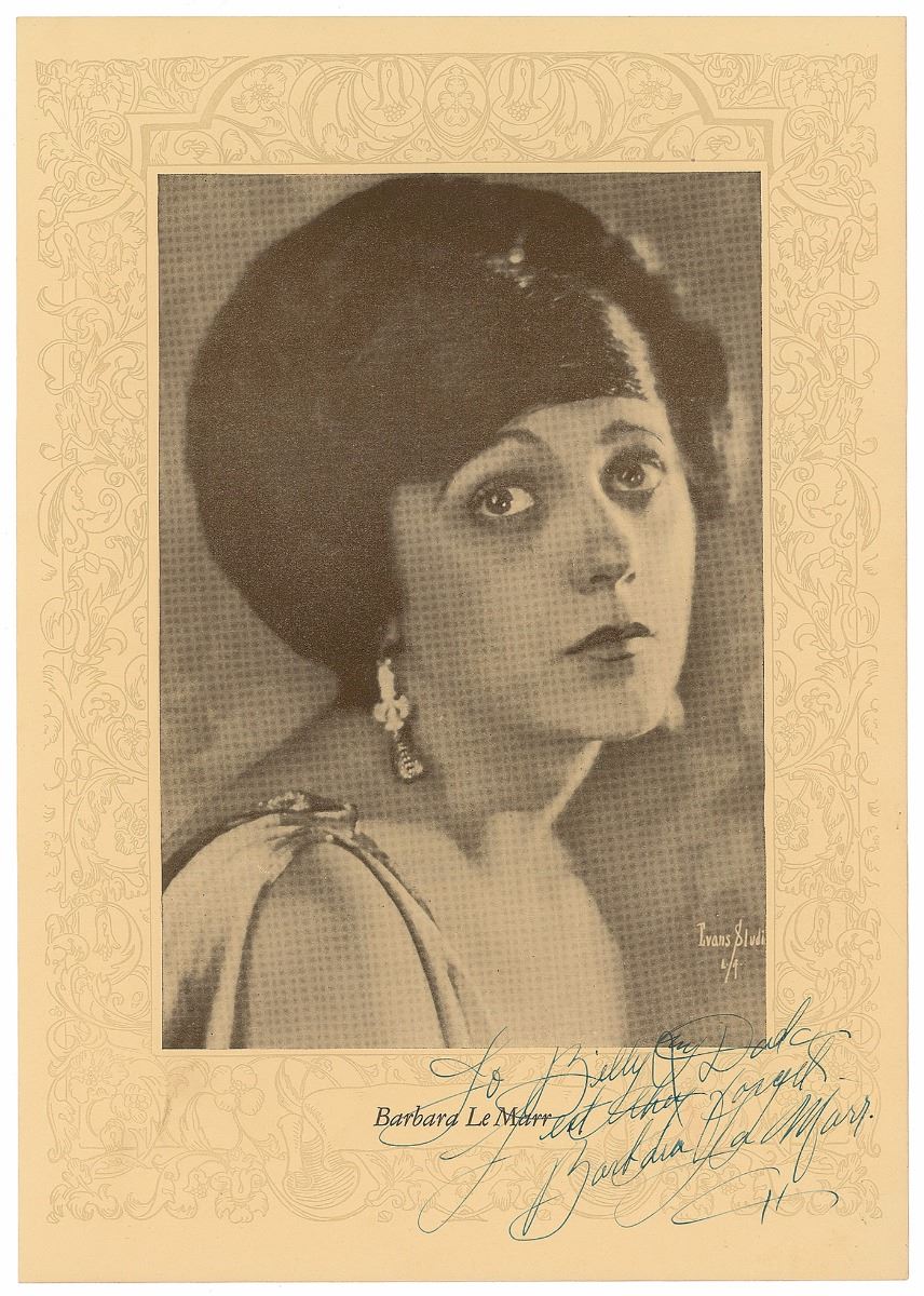 Beautiful silent screen star and early horror actress (1896–1926) who lived an extravagant Hollywood lifestyle and died tragically young of tuberculosis. Exceedingly rare 7.5 x 10.5 paperstock photo of Le Marr removed from a 1923 dinner program, signed and inscribed in blue ink, “To Billy & Dad, Lest they forget, Barbara La Marr.” In fine condition, with a small tear to bottom edge. Signed during the whirlwind prime of her career—La Marr made nine films in 1923—this is a charming depiction of the ill-fated starlet, and only the second La Marr autograph we have offered.
