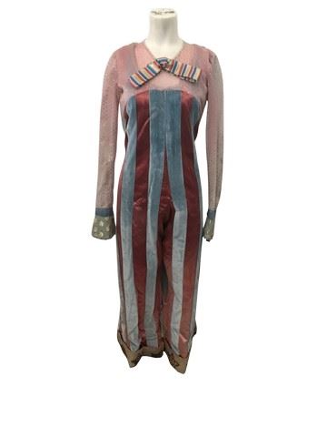 This multicolor clown jumpsuit is complete with a whimsical built-in colorful tie. Adding a touch of regal spectacle, it's paired with a stunning blue royal-style long vest, accented with a bold red collar and glittering gold trim.
