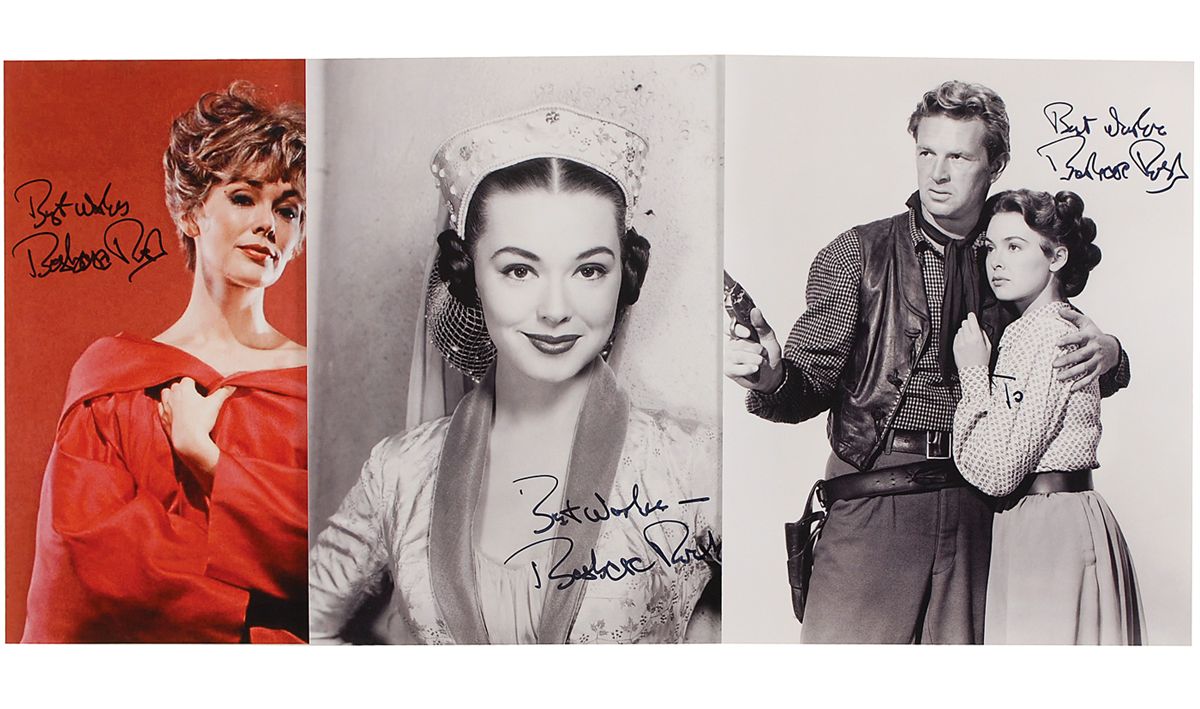 Three different satin-finish 8 x 10 photos from throughout Rush’s career, including one color, each signed in black felt tip, “Best wishes, Barbara Rush.” In fine condition.