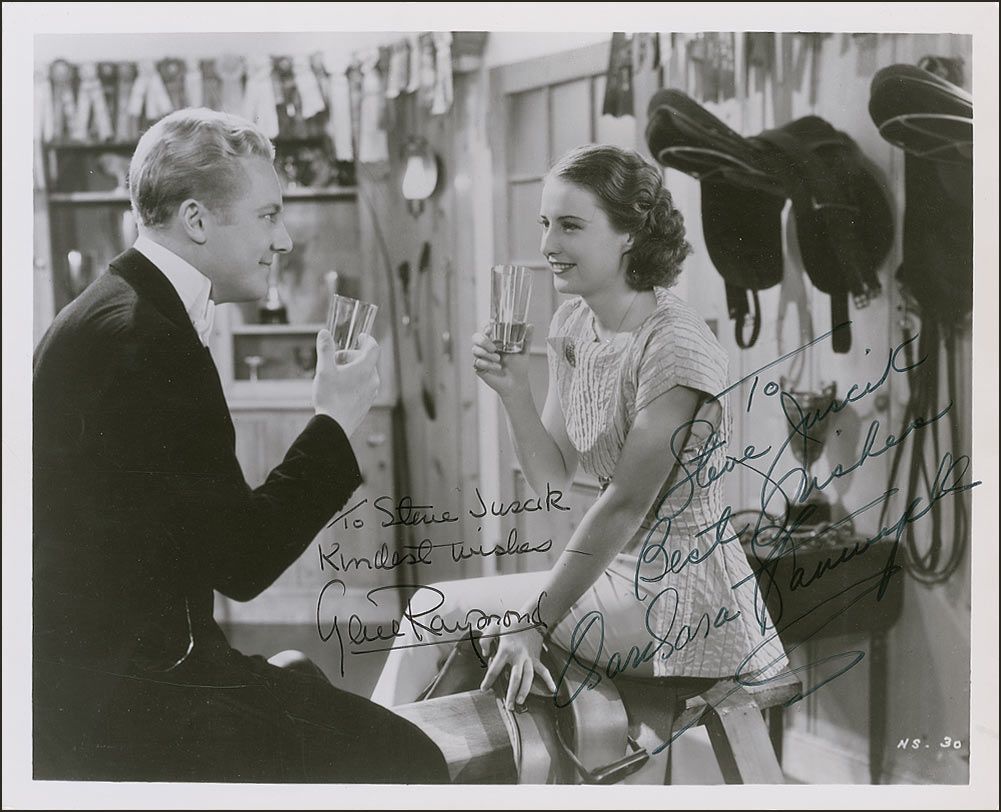 Glossy 10 x 8 photo of the two sharing a cocktail in one of their films, signed and inscribed in black felt tip “To Steve Juscik, kindest wishes—Gene Raymond,” and “To Steve Juscik, Best wishes, Barbara Stanwyck.” Some scattered creases and surface marks and some light contrast to Stanwyck‘s signature, otherwise fine condition.