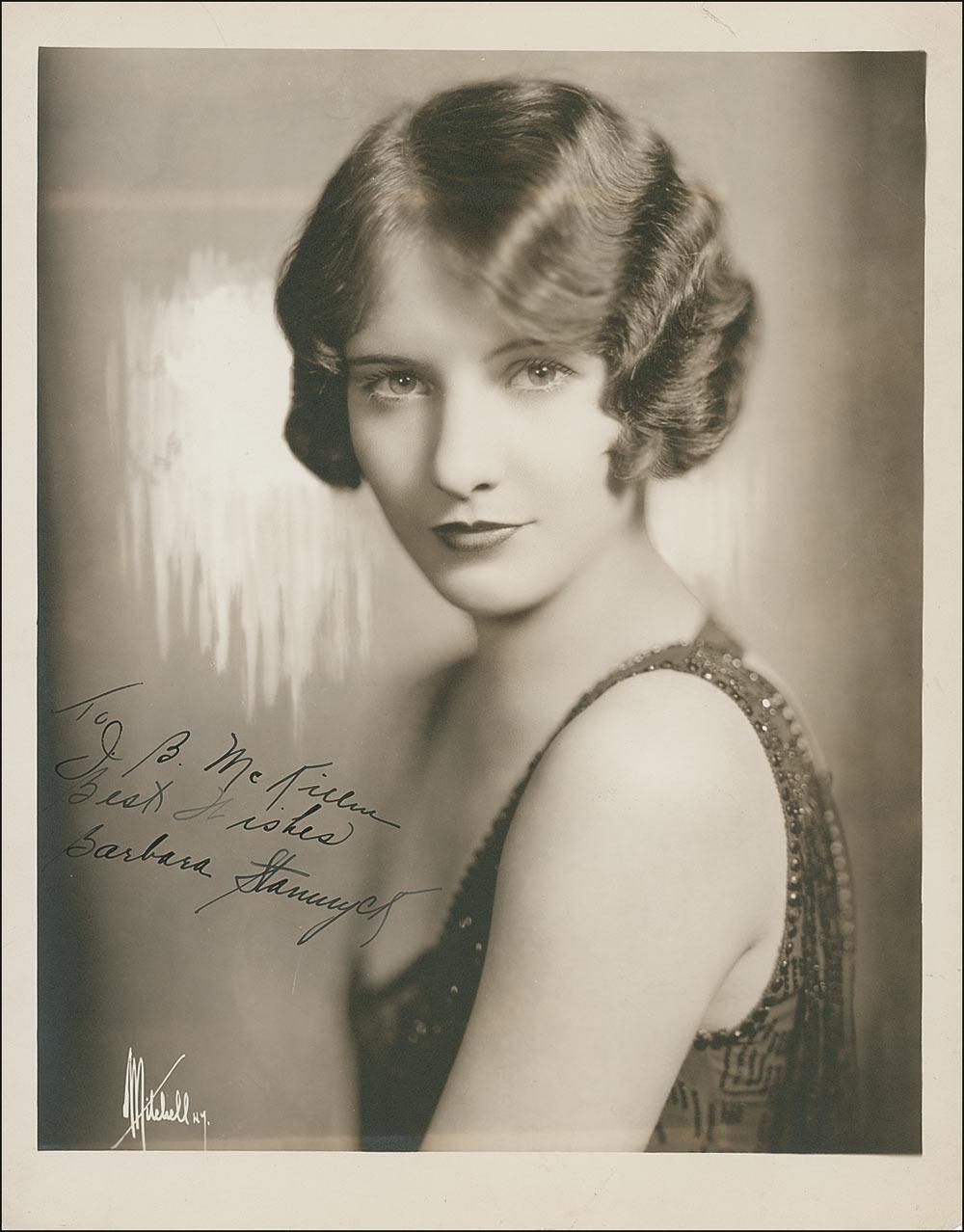 Very early vintage matte-finish 11 x 14 photo, signed and inscribed in fountain pen “To J. B. McKillen, Best wishes, Barbara Stanwyck.” Diagonal creases to top corners, small creases to bottom corner tips, diagonal crease to background, and a light area of toning along bottom, otherwise fine condition. Many of the flaws could be matted out.