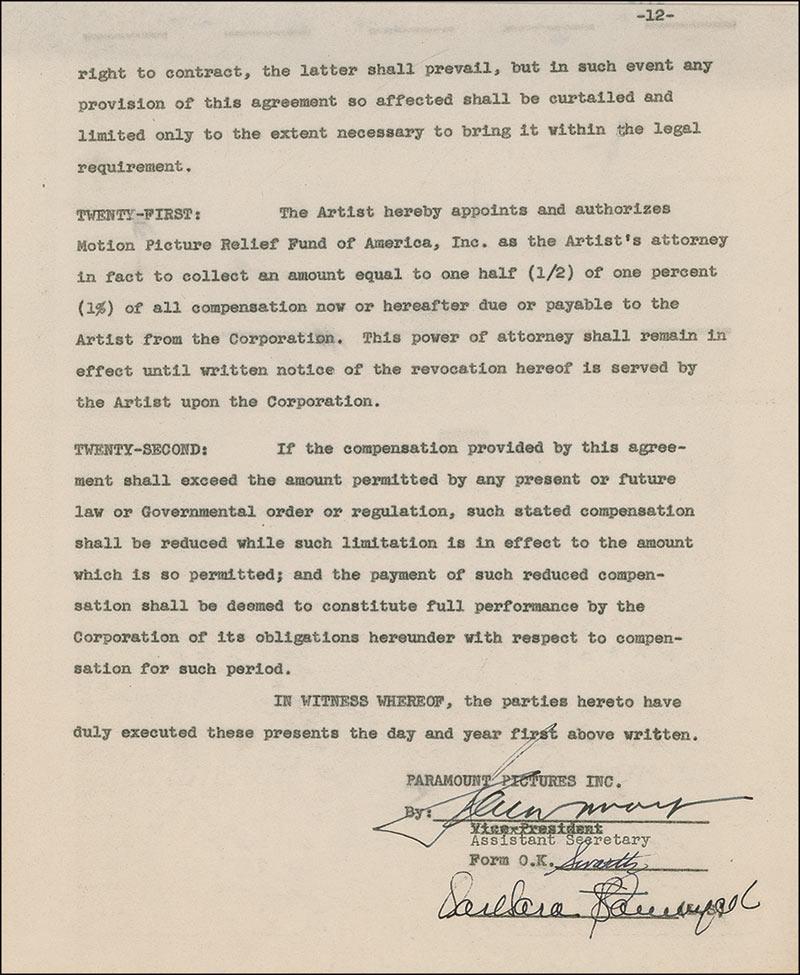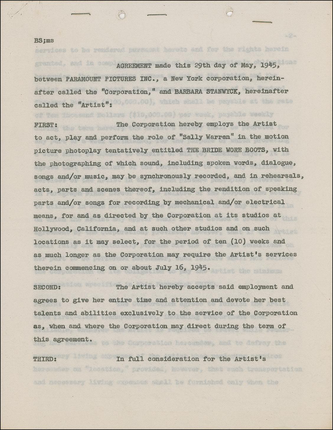 DS, signed “Barbara Stanwyck,” twelve pages, 8.5 x 11, May 29, 1945. Agreement between Stanwyck and Paramount Pictures “to act, play and perform the role of ‘Sally Warren’ in the motion picture photoplay tentatively entitled THE BRIDE WORE BOOTS…the Artist agrees to accept, the minimum compensation of…$100,000.00, which shall be payable at the rate of…$10,000 per week.” In fine condition, with two office punch holes, three staples at the top, and a few small staple holes.