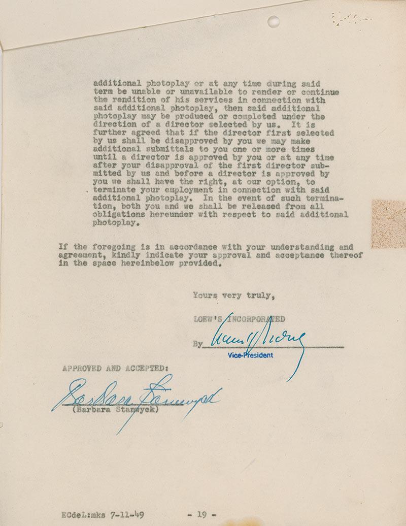 DS, signed “Barbara Stanwyck,” twenty pages, 8.5 x 11, July 11, 1949. Agreement between Stanwyck and Loew’s Incorporated “to render your services for us as an actress to portray the role of ‘Jessie Bourne’ in…‘East Side, West Side.’” In very good condition, with spots of staining at the extreme bottom edge, an area of old tape repair on the signed page with related staining, two office punch holes, two staples at the top, and several small staple holes.