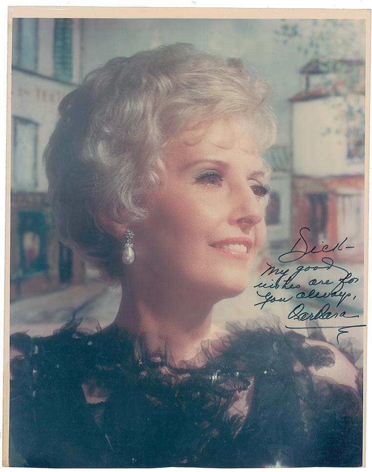 Color matte-finish 11 x 14 head-and-shoulders photo, signed and inscribed in black felt tip, “Dick–My good wishes are for you always, Barbara.” Light soiling to left edge, light staining to lower left corner and trimmed edges, otherwise fine condition.