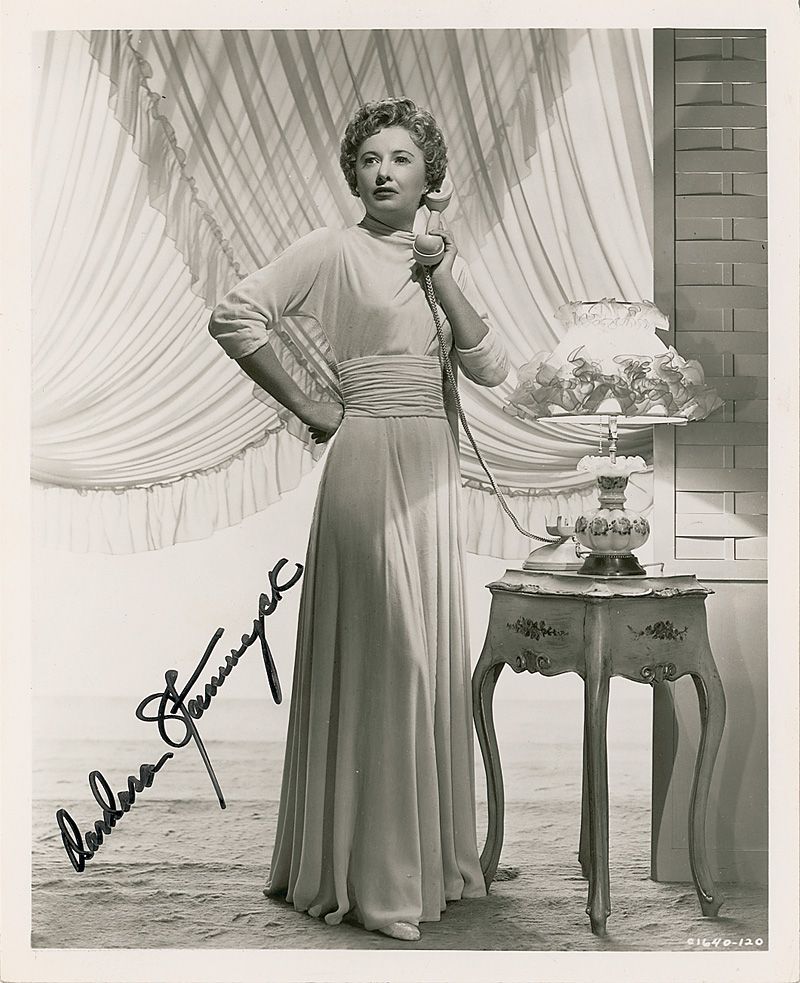 Glossy 8 x 10 full-length photo of Stanwyck on the telephone, signed in black felt tip. Scattered bends, creases, and impressions, otherwise fine condition.
