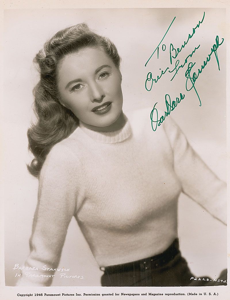 Attractive glossy 7.75 x 10 Paramount publicity photo, signed and inscribed in green felt tip, “To Eric Benson, from Barbara Stanwyck.” In fine condition, with slightly trimmed left and right edges.