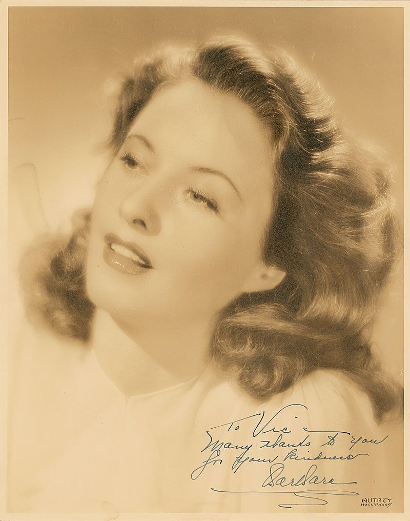Glowing vintage matte-finish 11 x 14 portrait of Stanwyck by Max Munn Autrey, signed and inscribed in fountain pen, “To Vic, Many thanks to you for your kindness, Barbara.” In fine condition, with very mild stains to the lower edge, left border, and her forehead (. Originates from the personal collection of Victor Johnson, who worked as a gaffer at Warner Bros. for over forty years.