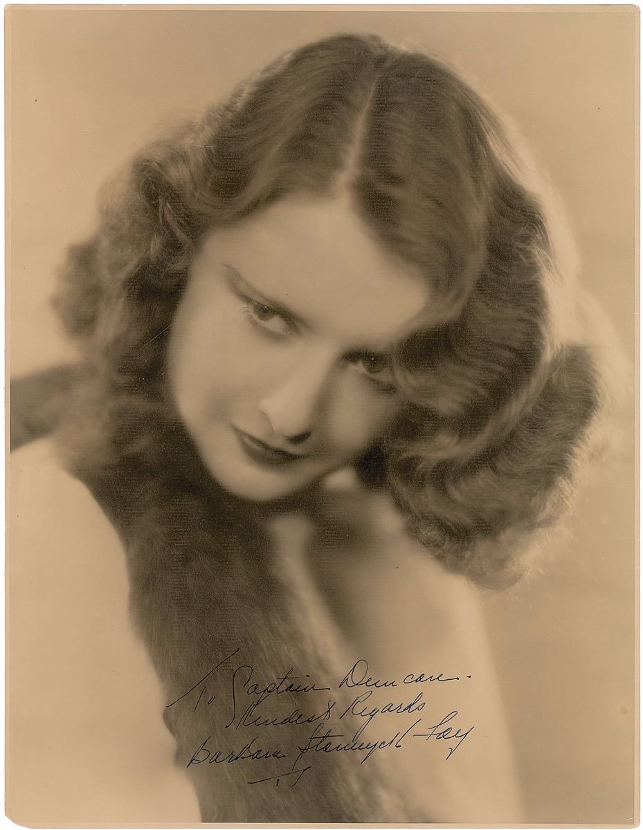 Stunning oversized matte-finish 10.5 x 13.5 portrait of the actress early in her career, signed and inscribed in fountain pen, “To Captain Duncan, Kindest Regards, Barbara Stanwyck Fay.” Light scattered creases and trimmed edges and corners, otherwise fine condition.