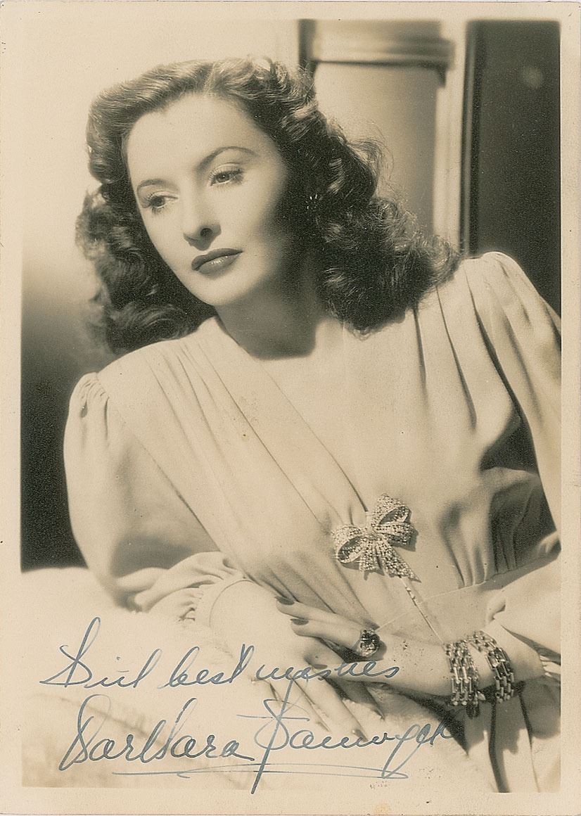 Vintage matte-finish 5 x 7 half-length photo of the award-winning actress in a sultry reclined pose, signed in fountain pen, "With best wishes, Barbara Stanwyck." In fine condition.