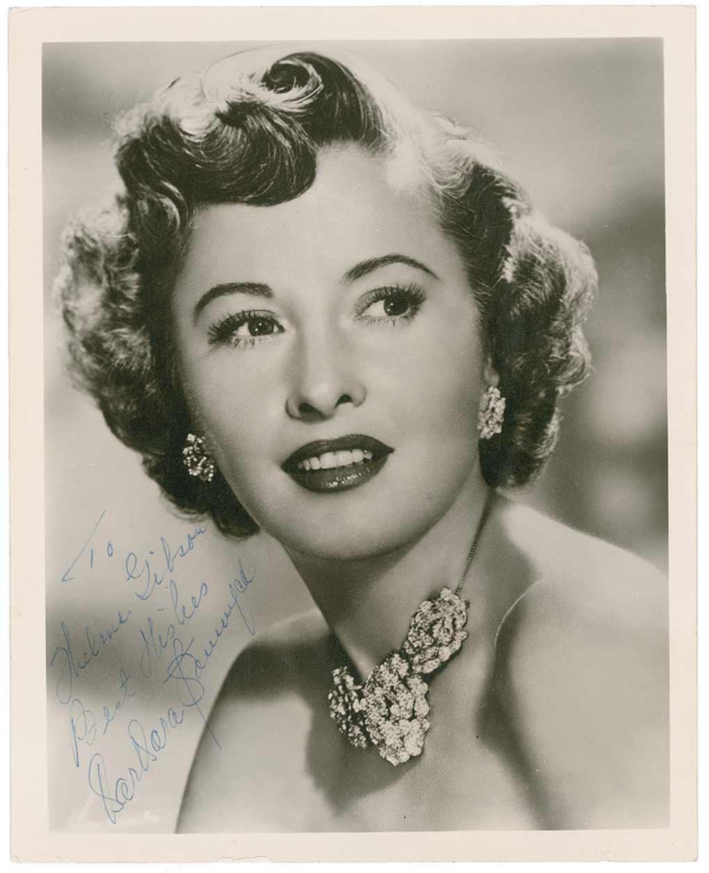 Vintage matte-finish 8 x 10 head-and-shoulders photo, signed and inscribed in blue ballpoint “To Thelma Gibson, Best wishes, Barbara Stanwyck.” In fine condition, with just a bit of light edge rippling and creasing.