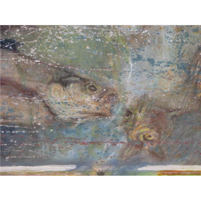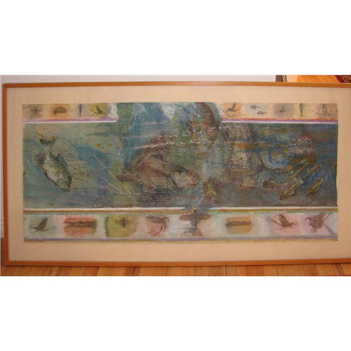 Description: An abstracted river edge with frieze bands of dragonflies and other insects