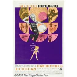 <B>Barbarella (Paramount, 1968)</B></I> One Sheet (27" X 41") Style B. Jane Fonda as the voluptuous outer space agent, Barbarella, crash-lands on the Tau Seti system where she discovers the joys of interstellar sex with a variety of characters. There is just a touch of fold line wear and corner pinholes. The poster had professional touch up to work performed to these minor defects. This One Sheet for the '60s classic is an incredibly scarce Style B One Sheet. Very Fine+ on Linen.