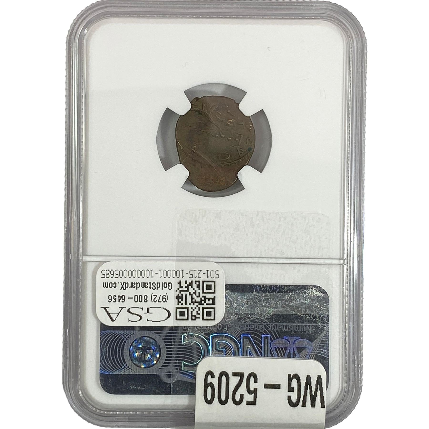 e. Coins sold referencing a third-party grading service are sold “AS IS” without any express or implied warranty, except for a guarantee by GSA that they are genuine. Removal or alteration of the holder, voids all of Bidder’s claims concerning that Product. Certain warranties may be available from the grading services and Bidders are referred to them for further details: Numismatic Guaranty Corporation (NGC), PO Box 4776, Sarasota, FL 34230, www.ngccoin.com/services/writtenguarantee.asp; Professional Coin Grading Services (PCGS), PO Box 9458, Newport Beach, CA 92658, www.pcgs.com/guarantee.html; ANACS, 6555 S. Kenton St., Ste. 303, Englewood, CO 80111; and Independent Coin Grading Co. (ICG), 7901 East Bellview, Ave., Suite 50, Englewood, CO 80111.