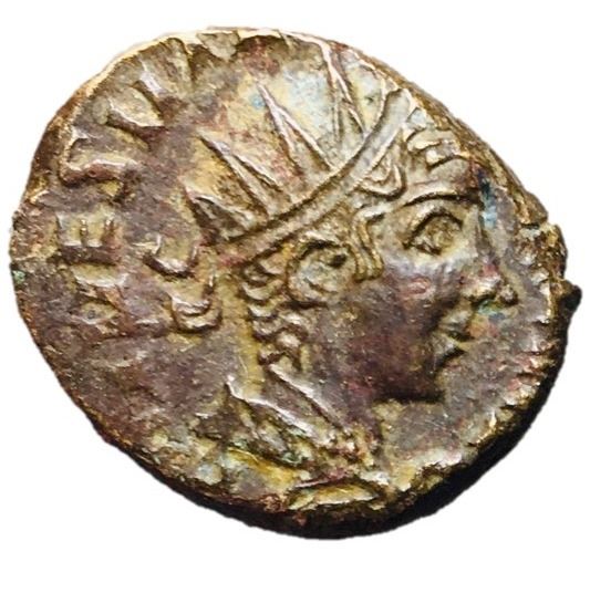 Barbarous Radiates, 3rd Century AD. AE 'Antoninianus', Mint in Britain or Gaul, 16mm, 2.95 grams. Obverse: Radiate head of emperor right, blundered legend around. Reverse: Spes standing left raising hem of skirt. RCV Vol. III, pg. 413. The numismatic term 'barbarous radiates' refers to these unofficial coins made locally imitating antoninianii of the period. The crisis of the Third Century was a 50 year period of general anarchy for the Roman empire, generally starting with the death of Severus Alexander in 235 and ending with the reunification under Diocletian in 284. During this time the provinces experienced a severe lack of coinage. To fill the void small denomination coinage was unofficially issued in very large numbers. The die engravers, or celators, were obviously illiterate and of quite limited artistic capabilities. The end result is a fascinating series of coins with generally unreadable inscriptions and depictions of gods and goddesses with improper or mis-matched attributes.
