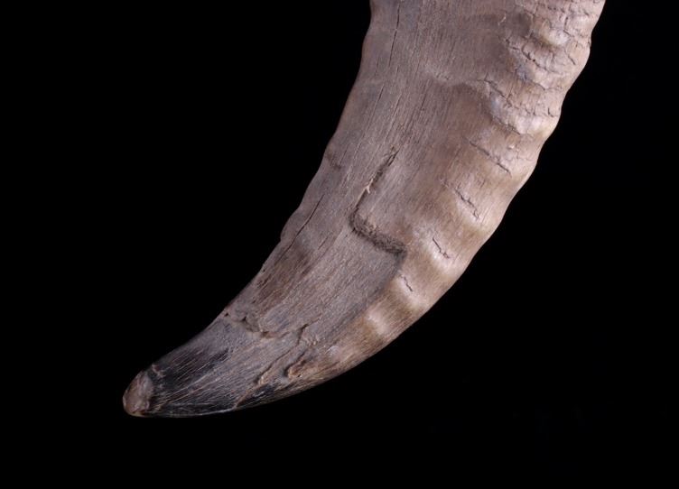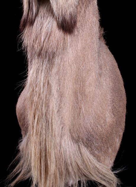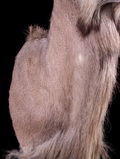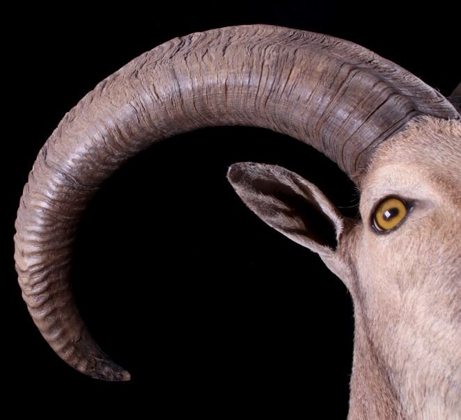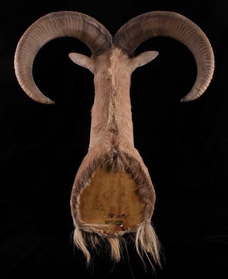 This is a Barbary Aoudad sheep shoulder mount. The Barbary Aoudad is a rare creature, naturally found in Northern Africa, and was introduced to North America, and Southern Europe. The Barbary Aoudad typically displays sandy brown coloring, with a shaggy strip down the throat. Overall, the mount shows good condition. The mount measures 22 1/2" deep from the mounting surface, 26" wide from the outside of each horn, and 28 1/2" tall.