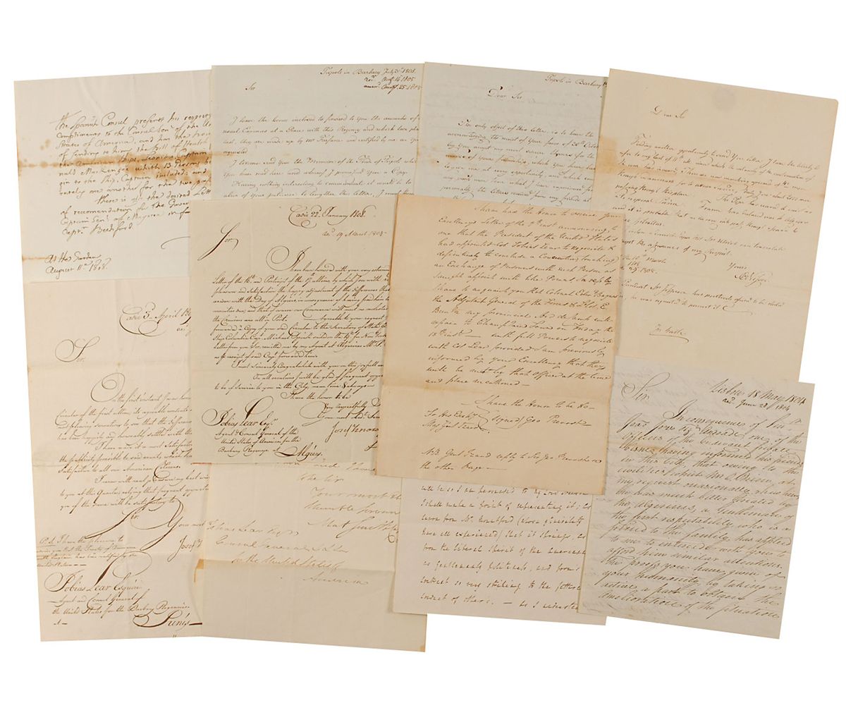 Archive consisting of ten letters related to the Barbary Wars, dated between 1804 and 1818, all addressed to Tobias Lear, the US consul general at Algiers who had formerly served as George Washington’s private secretary. Three letters are from N. C. Nissen, Danish consul at Tripoli, and mention Commodore John Rodgers and “pleasure of seeing arrive here one of the U. States Gunboats...who brought information of the victories of the French in Naples.” Nissen’s most interesting letter, dated March 10, 1808, in part: “There are now marching upwards of 40/m men through Denmark for to attack Sweden. Daily I see about 2000 more marching through this place. The Pope has ceased to exist as a Temporal Prince. France has declared war to Algiers and it is probable that an army will pass through Spain to attack Gibraltar...The President Mr. Jefferson has positively refused to be elected again, he was requested to permit it.” Two letters from Josef Iznardi, one mentioning a letter to the “Secretary of State,” James Madison. One letter from William Jarvis, complimenting Lear on the “proofs you have given of your humanity, by taking so active a part to obtain the amelioration of the situation of the Portuguese prisoners in Algiers.” Also included are letters from Captain Mat. Smith, R. G. Keats, a Spanish consul, and an 1814 manuscript copy of a letter regarding President Jefferson’s appointment of Lear to negotiate an exchange of prisoners. In overall very good to fine condition, with various folds, creases, foxing, and toning.