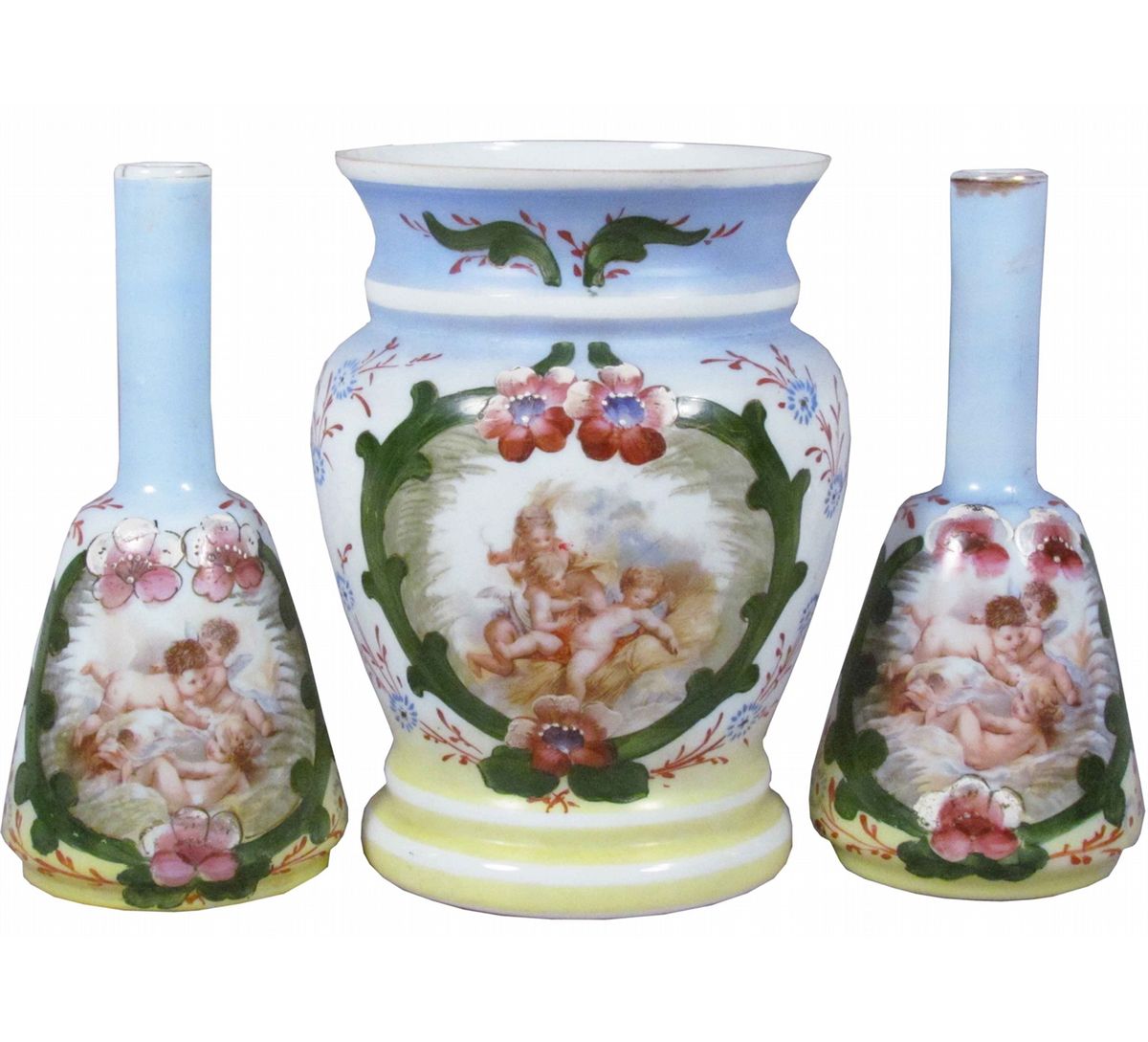 Pair of Barber Bottles and Matching Waste Container. Hand painted with cherub motif. Gold leaf edges worn otherwise no chips or cracks. Container measures 7 3/4 inches tall X 5 inch diameter.