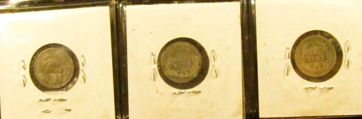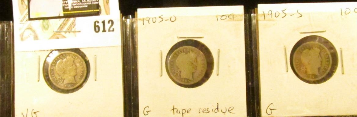 Barber Dime lot: 1905 P VG, 1905 O G tape residue, & 1905 S Good.