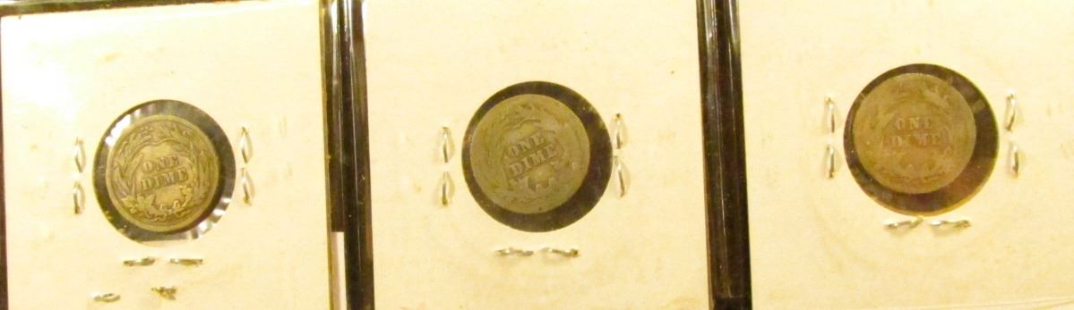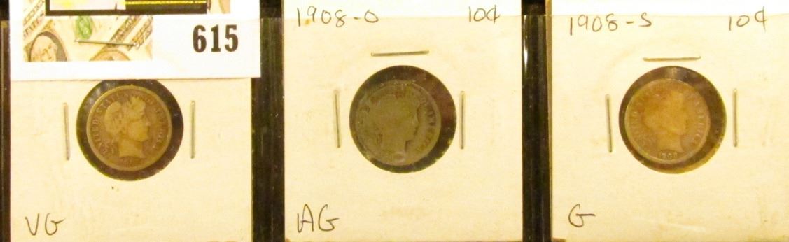 Barber Dime lot: 1908 D VG, 1908 O AG, & 1908 S G.