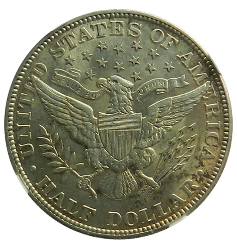 Barber Half Dollar, 1915. Key date. NGC AU55, lt rb obv. Lustrous, gold toning.
