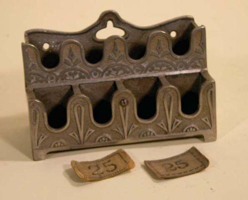 Barber shop check rack - Koken Supply Company, St. Louis, MO. Nickel plated cast iron, comes with 2 checks. Rare.
