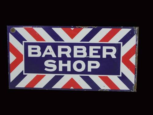 Two sided porcelain flange sign for Barber Shop, 12 inches x 24 inches, porcelain is chipping around edges. Otherwise Good.