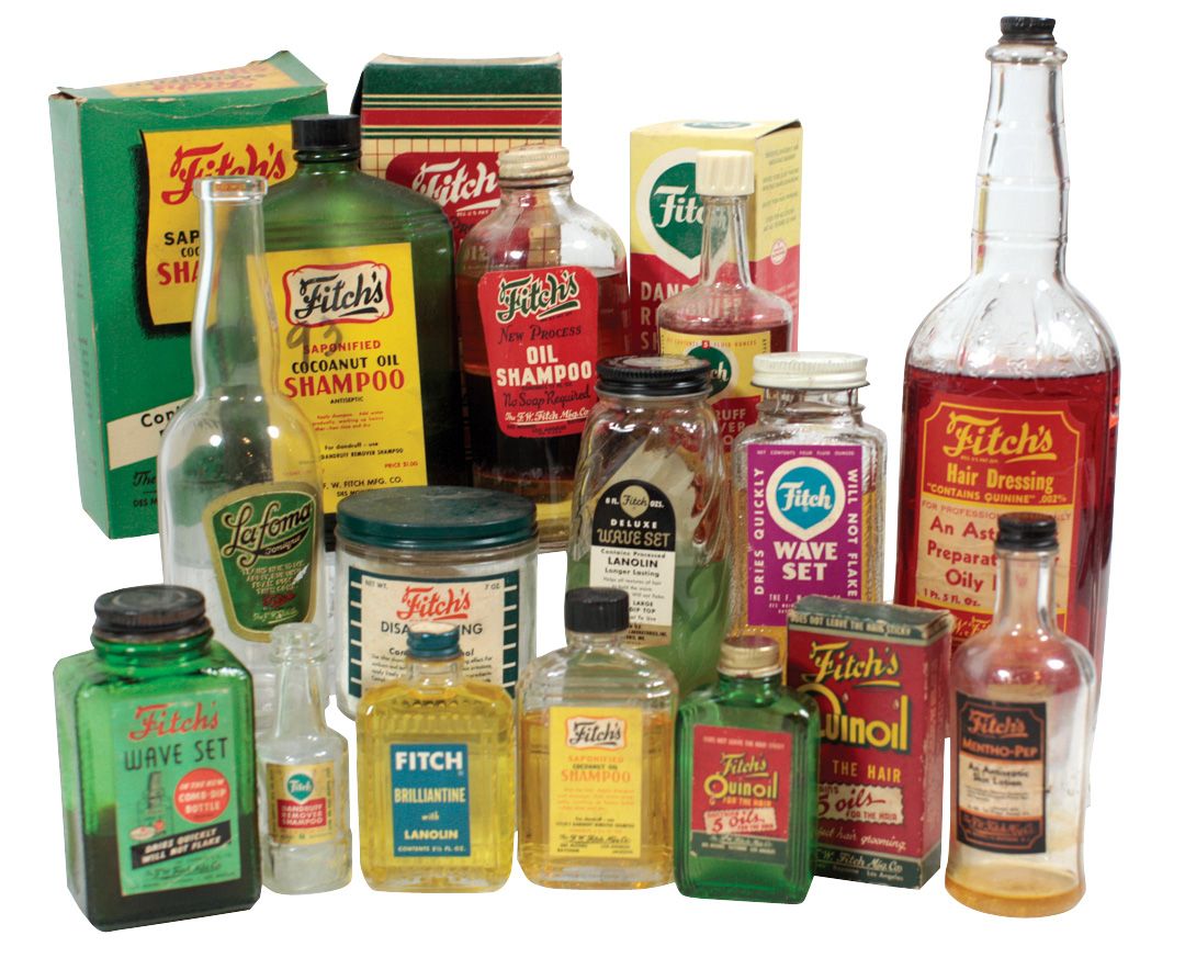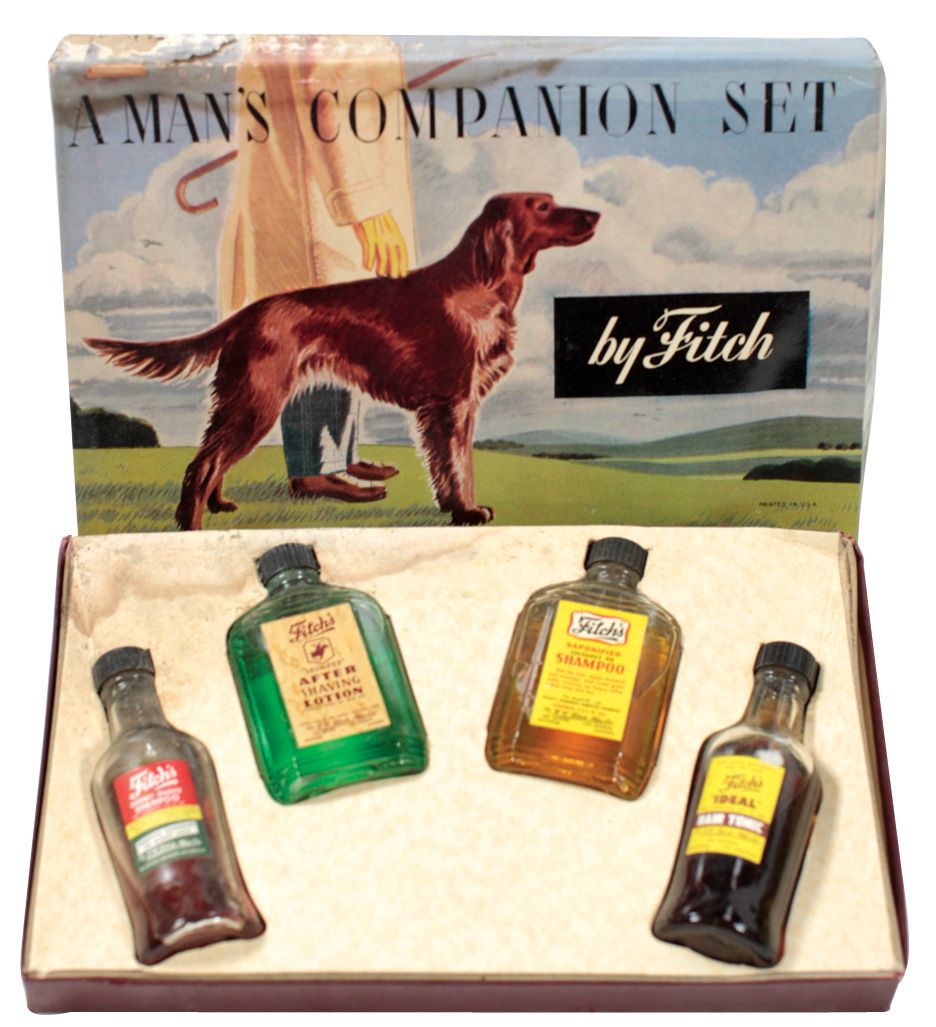 Barbershop supplies (15), Fitch's grooming products, incl NOS "A Man's Companion Set" in box, others w/orig contents & some w/out, some have paper labels & others are embossed, VG/Exc cond, bottles to 10.5"H.