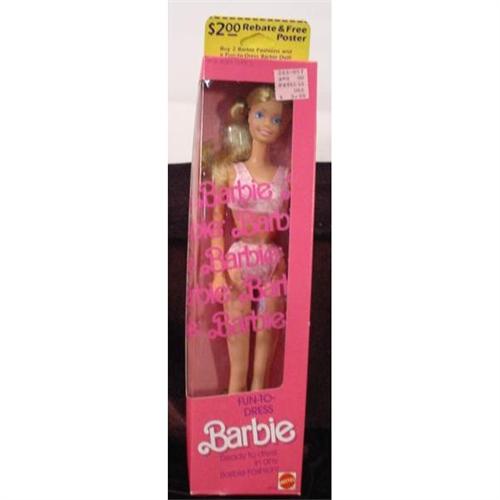 Mint Condition Barbie, 1987. "Fun-to-Dress" Barbie is a blank slate to be dressed in Barbie Fasion. Box measures 12" x 3" x 2" and weighs 8 ounces. [81]