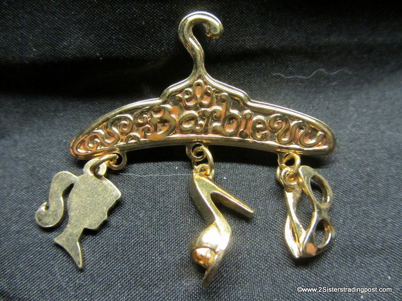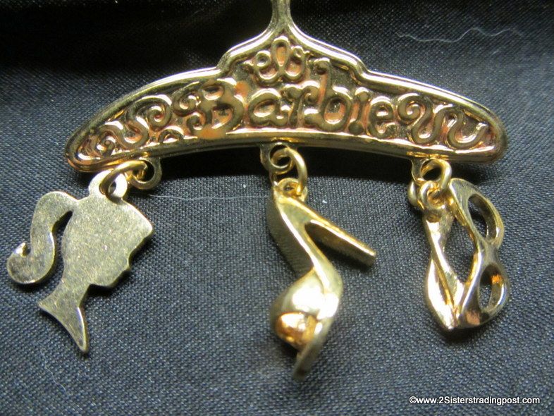 'Barbie' as part of the design and the three charms that hang of the hanger is a silhouette of Barbie's head, high heel shoe and a pair of sunglasses. Perfect gift for any Barbie enthusiast or collector. NOTE: is not in the original box