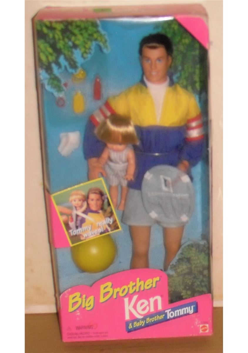 An Barbie doll is this great collectible 1996 Ken one with his brother Tommy; with ball and other objects such as a diaper, bottle, etc., as you can help Ken bounce Tommy up and down... Tommy waves; you can take Ken and Tommy out for a super fun day at the park (with your parents) as Tommy loves to ride in his baby carrier pack on the back of his bug brother Ken; note that these wonderful 2 dolls are MINT in not opened original box by Mattel; add to your collection or start one or give to a friend now !