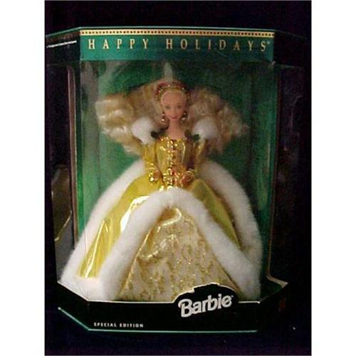 Barbie Special Edition 1993. Happy Holidays Barbie is glamorous in gold & white. Fabulous accessories include a gold ring, beaded head adornment and a touch of holly on the gown. Sure to satisfy any Barbie Collector.