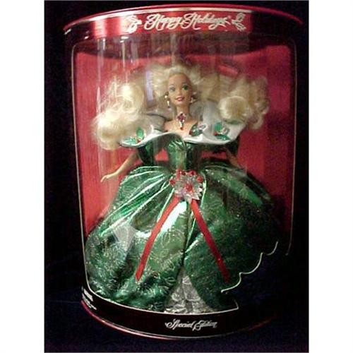 Happy Holidays Barbie is regal in this silver and green holly gown. Accented just perfectly with a touch of red ribbon. Barbie is in very good condition sure to please any Barbie collector.