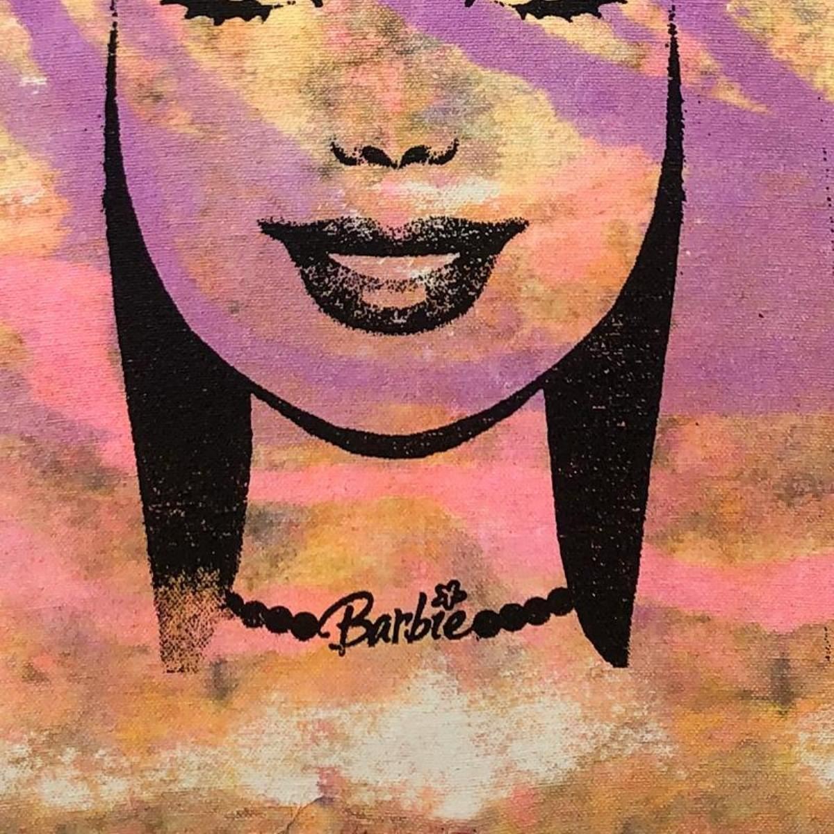 "Barbie" is an original hand pulled silkscreen and acrylic painting on canvas by Gail Rodgers. Hand signed by the artist, the piece comes with a letter of authenticity. This piece is meant to be gallery wrapped and measure approximately 23" x 23" and image dimensions (after stretching) 16" x 16" (image).