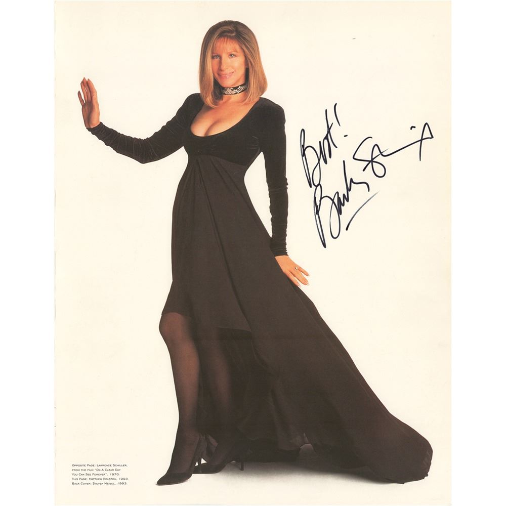 Color 11 x 14 cardstock photo of Streisand in a full-length pose, evidently removed from an oversized book or program, signed in black felt tip, "Best! Barbra Streisand." In fine condition.