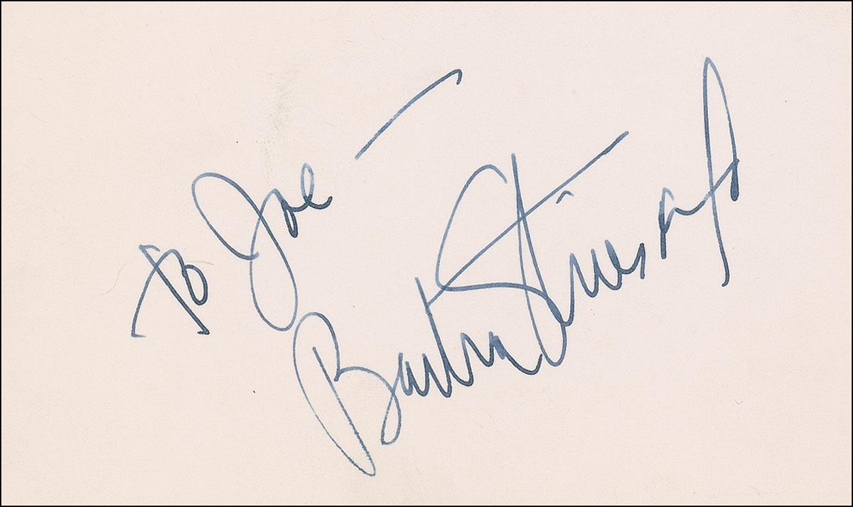 Vintage fountain pen in-person signature and inscription, “To Joe–Barbra Streisand,” on an off-white 5 x 3 card. In fine condition, with a hint of trivial soiling above inscription.