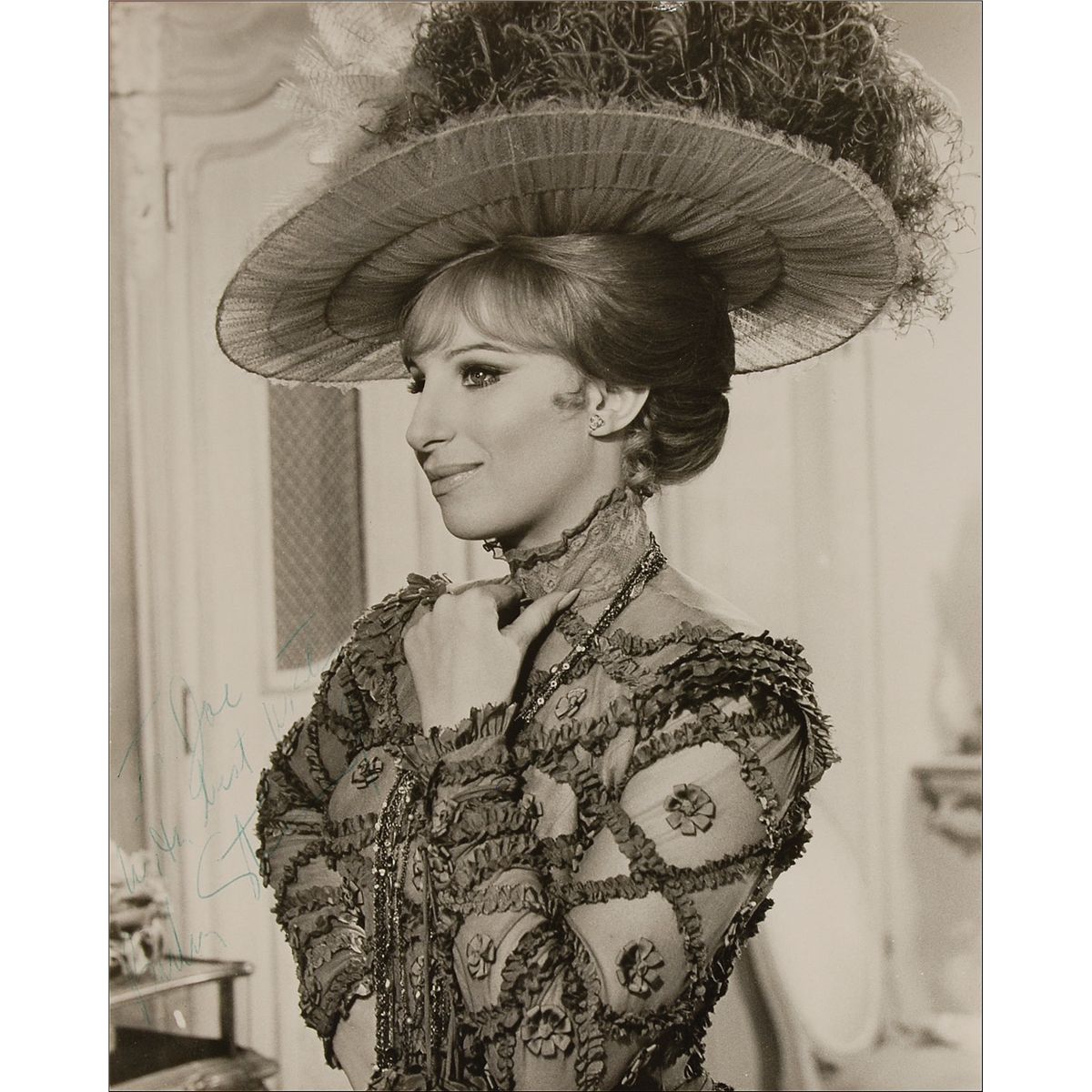 Fantastic vintage matte-finish 7.5 x 9.25 photo of Streisand from the 1968 production of Hello Dolly, signed and inscribed in green ballpoint, “To Joe, With best wishes, Barbra Streisand.” Framed with an irregularly clipped slip notating from where the image was taken to an overall size of 11 x 14. Scattered light creases, trimmed edges, and moderate contrast to the signature, otherwise fine condition. An elusive and highly-desirable image of a young and gorgeous Streisand from one of her earliest films.