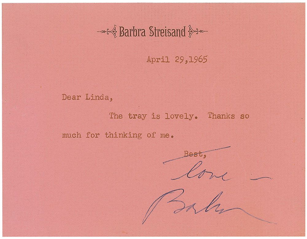 TNS signed “Love—Barbra,” one page, 5.5 x 4, personal letterhead, April 29, 1965. Brief note of thanks for a gift. In full: “The tray is lovely. Thanks so much for thinking of me.” In fine condition.