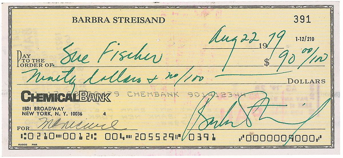 Personal check, 6 x 2.75, filled out and signed by Streisand, payable to Sue Fischer for $90.00, August 22, 1979. A pencil notation in an unknown hand on the memo line indicates the check was for a manicure. In fine condition, with a central vertical fold and some show-through from stamps on reverse.