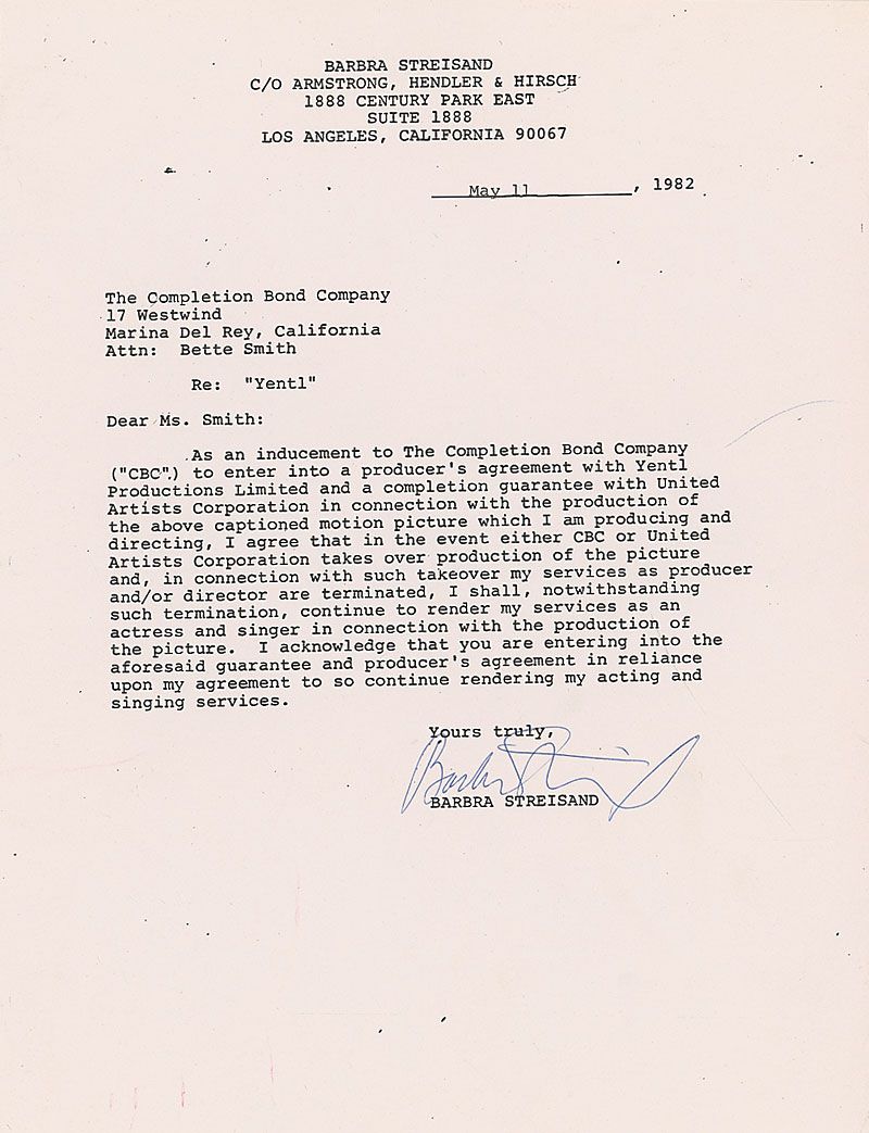DS, one page, 8.5 x 11, May 11, 1982. Document regarding the production of Yentl reads, in part: “I agree that in the event either CBC or United Artists Corporation takes over production of the picture and, in connection with such takeover my services as producer and/or director are terminated, I shall, notwithstanding such termination, continue to render my services as an actress and singer in connection with the production of the picture.” Signed at the conclusion in blue ballpoint. In fine condition, with expected document wear.