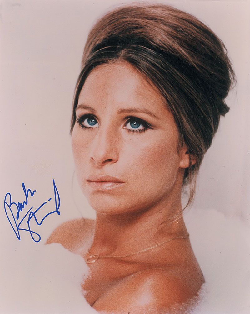 Color glossy 8 x 10 close-up photo of Streisand taking a bubble bath, signed in blue felt tip. In fine condition.