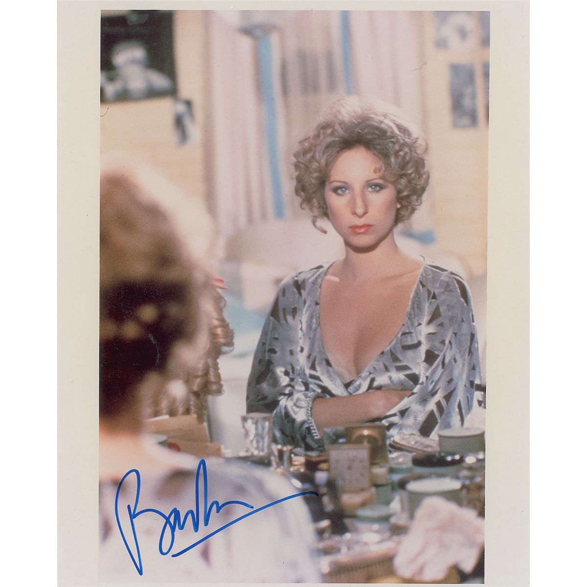 Color glossy 8 x 10 photo of Streisand reflected in a bedroom mirror, signed in blue felt tip. In fine condition.