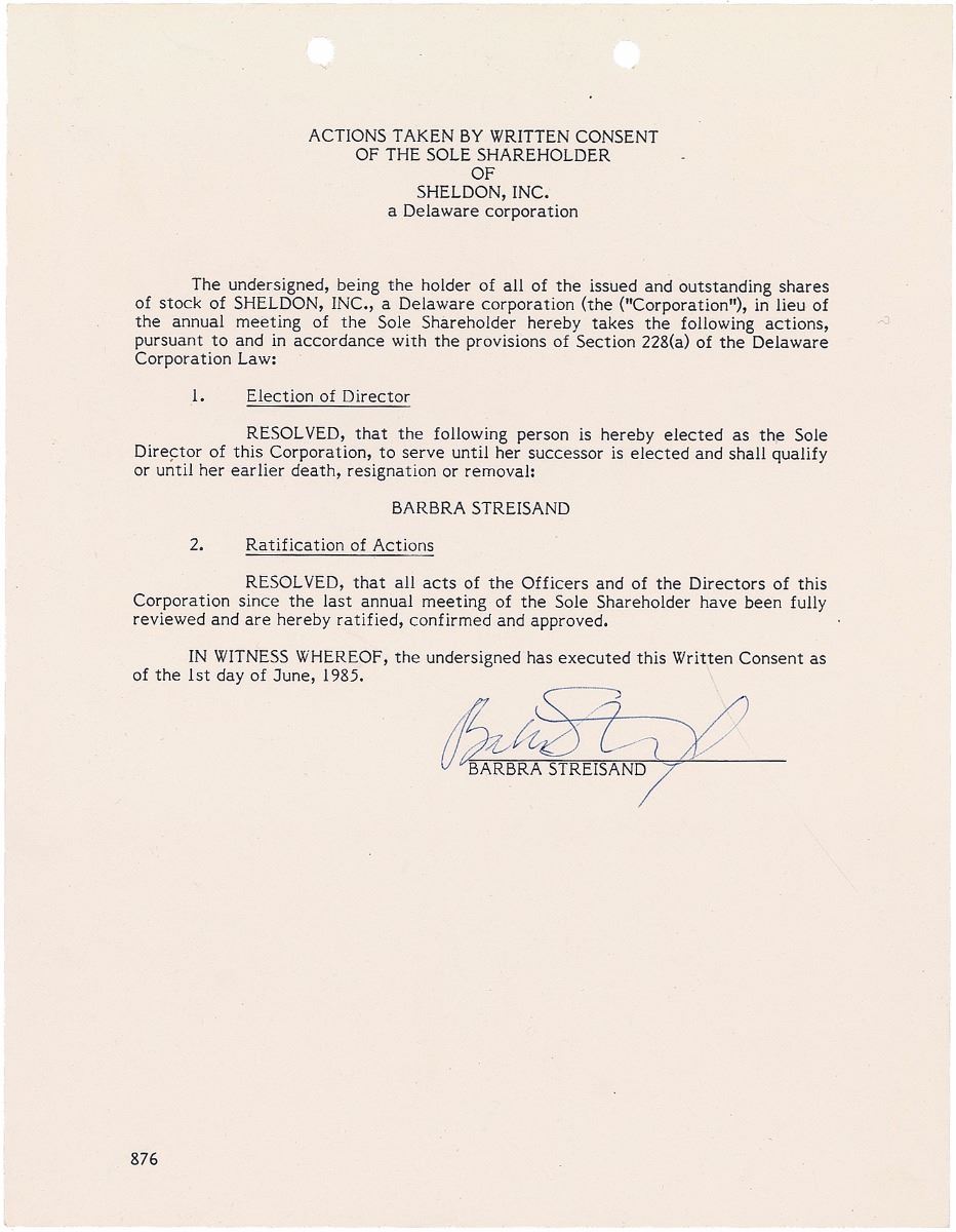 DS, one page, 8.5 x 11, June 1, 1985. Streisand, “being the holder of all of the issued and outstanding shares of stock of Sheldon, Inc.,” elects herself as “the Sole Director of this Corporation.” Signed at the conclusion in blue ballpoint. In fine condition, with light scattered creases and expected filing holes to the upper border.