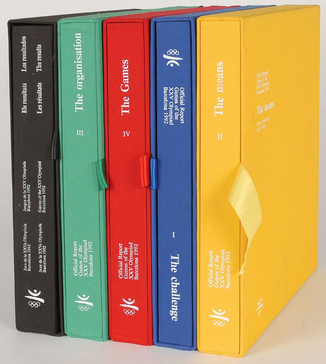 Uncommon five-volume set of the Official Report of the Games of XXV Olympiad Barcelona 1992. Barcelona, Spain: COOB'92, 1992. Hardcovers with slipcases, 9.75 x 12. In overall fine condition. Includes the rare fifth volume with comprehensive results of the 1992 Summer Games. Oversized.
