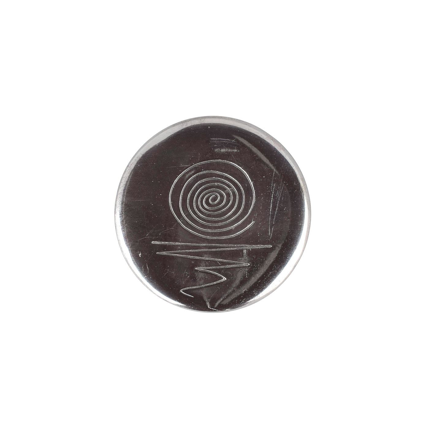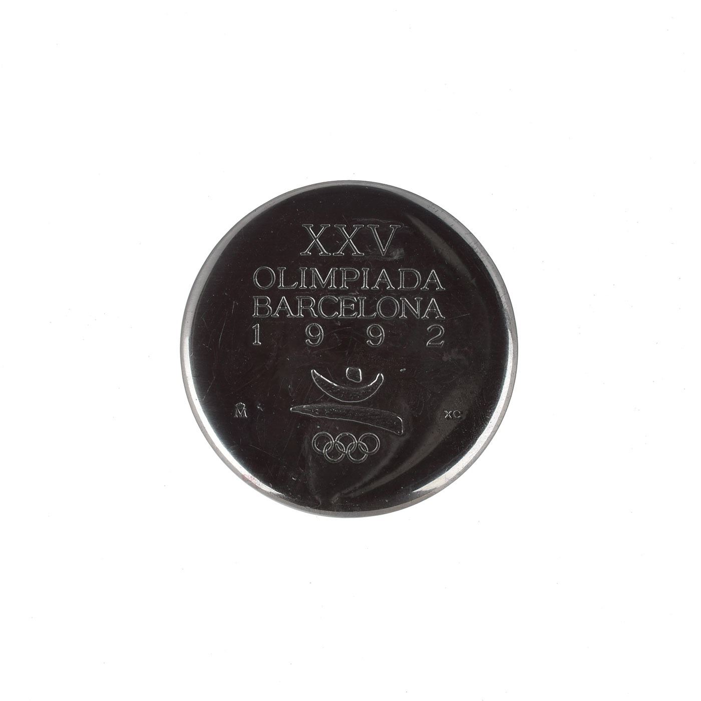 Participation medal issued for the 1992 Barcelona Summer Olympics. Burnished copper, 70 mm, 254 gm, by Xavier Corbero; manufactured by Fábrica Nacional de Moneda y Timbre. The front is engraved "XXV Olimpiada Barcelona 1992," with the Games logo of a stylized man leaping over the Olympic rings; the reverse bears an engraved spiral and elongated lightning bolt. Complete with its faded dark red pouch.