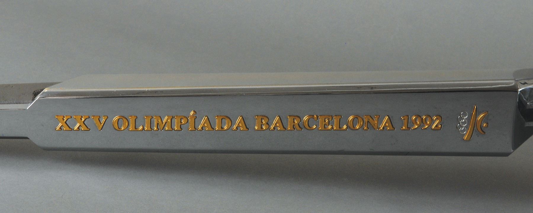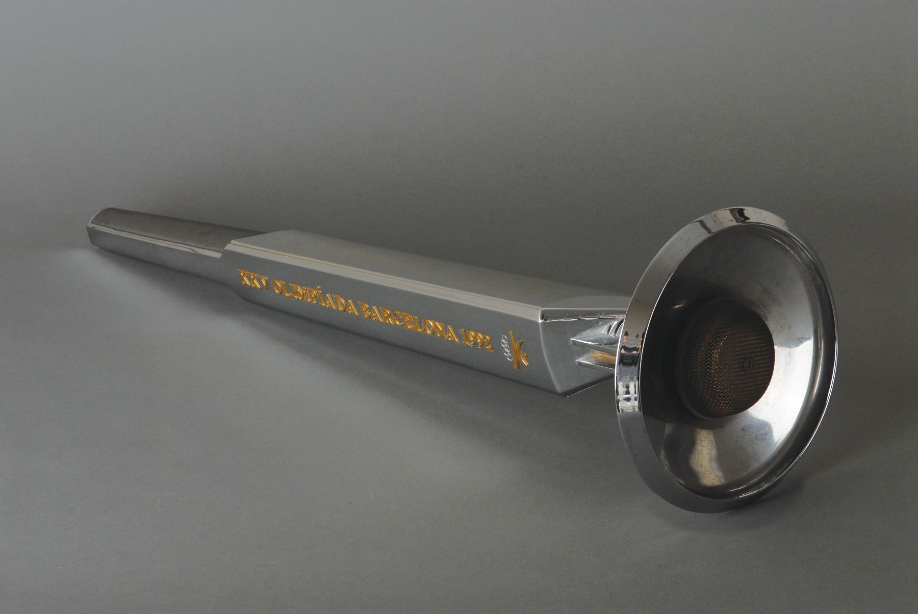 Official 1992 Barcelona Olympics torch, comprised of aluminum and plastic, measuring 26? in length and 7? at its widest point, designed by Andre Ricard. The metal body is inscribed in gold text, "XXV Olimpiada Barcelona 1992," and bears the emblem of the Games. Exhibits noticeable wear to the rubber grip. The massive fifty-day relay included nearly 9,500 torchbearers who carried the Olympic flame by foot and bicycle for a total of 5,940 km throughout Spain. The lighting of the cauldron at the opening ceremonies was especially memorable, as Paralympic archer Antonio Rebollo ignited the cauldron by shooting an arrow lit from the Olympic flame. A large, attractive torch with a decidedly modern design.