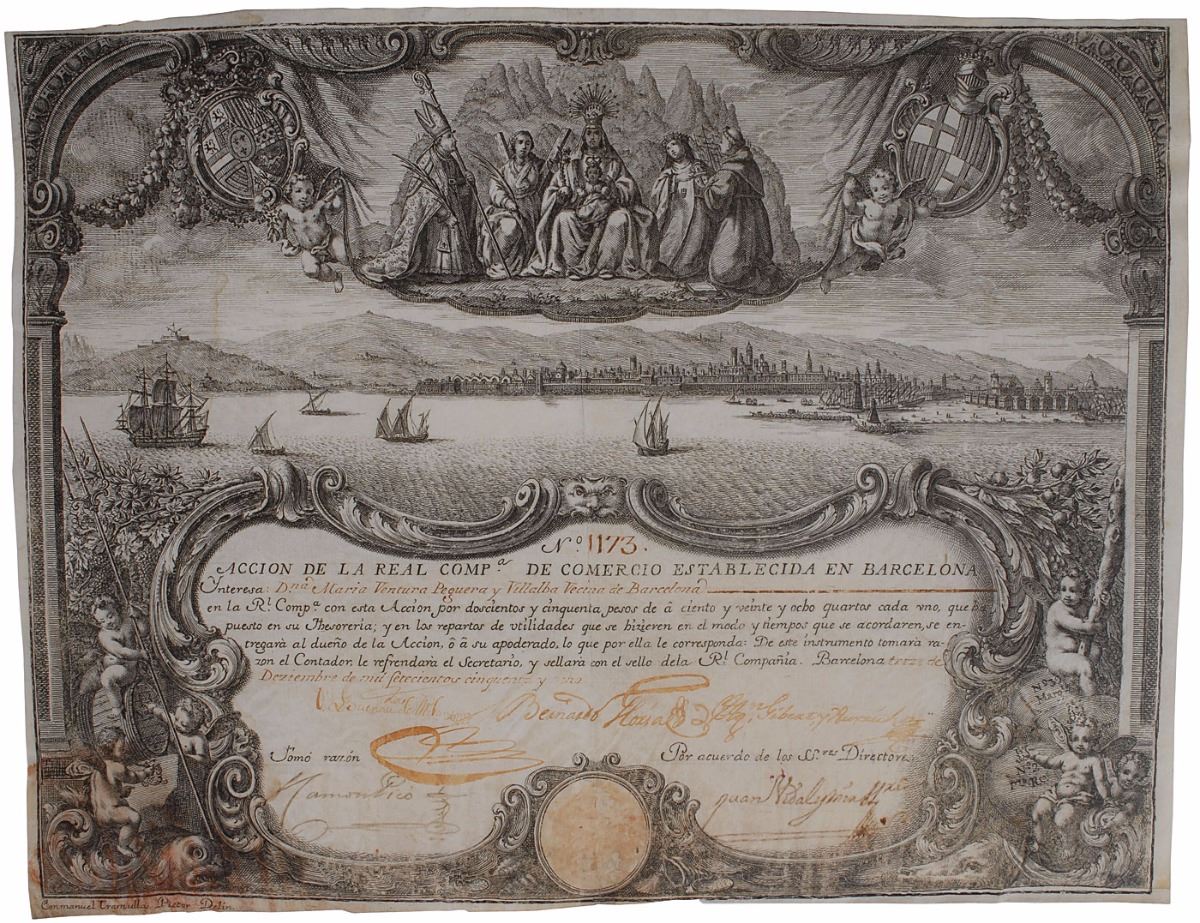 Partly-printed vellum DS in Spanish, one page, 16 x 12, 1758. Untranslated certificate for the Royal Trade Company of Barcelona, number 1173 for 250 pesos. Wonderfully engraved multi-vignetted certificate depicting royalty, religious, and allegorical figures surrounding an outstanding harbor view of Barcelona with numerous sailing ships and buildings. In fine condition.