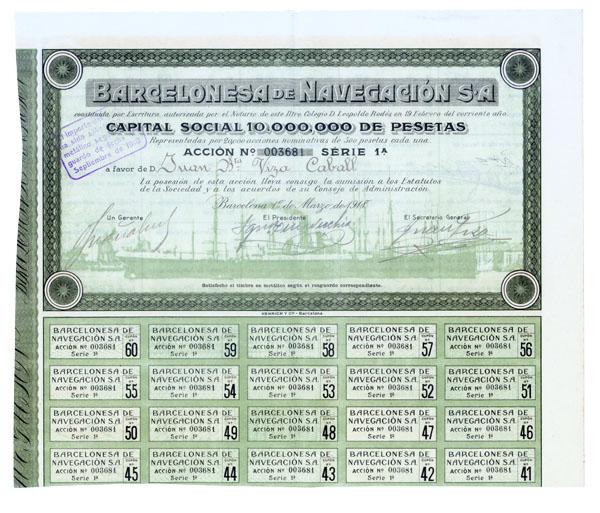 1918, Spain. Accion de 500 Pesetas. Green. Outstanding large green overprint of a steamship in a harbor at bottom. Litho. Partial coupons at bottom. Extremely fine.