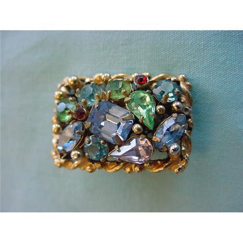 1 1/4 inch by 7/8 inch ** Bar Pin ** Beautiful Blue, Green, Red, and Pink Rhinestones Prong Set on Goldtone Metal ** Round, Marquise, Pear Shape and Rectangular Stones Individually Mounted ** Outstanding! ** Excellent Condition ** Circa 1940s